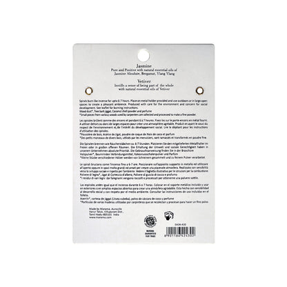 How to use: Insert the coil onto the relevant metal support, making sure that there is enough space around it and that it is kept away from flammable materials, shelves, walls, and other sources of heat. Light the tip and extinguish the flame after a few seconds, making sure that its combustion continues. Make sure that the ash falling from the incense does not come into contact with delicate or varnished surfaces, or fabrics. Burn in well-ventilated areas. Keep away from the reach of children and pets, and away from drafts. Let the product cool down completely before disposing of it.