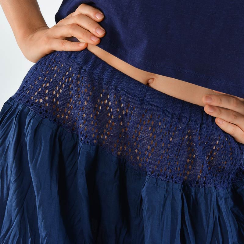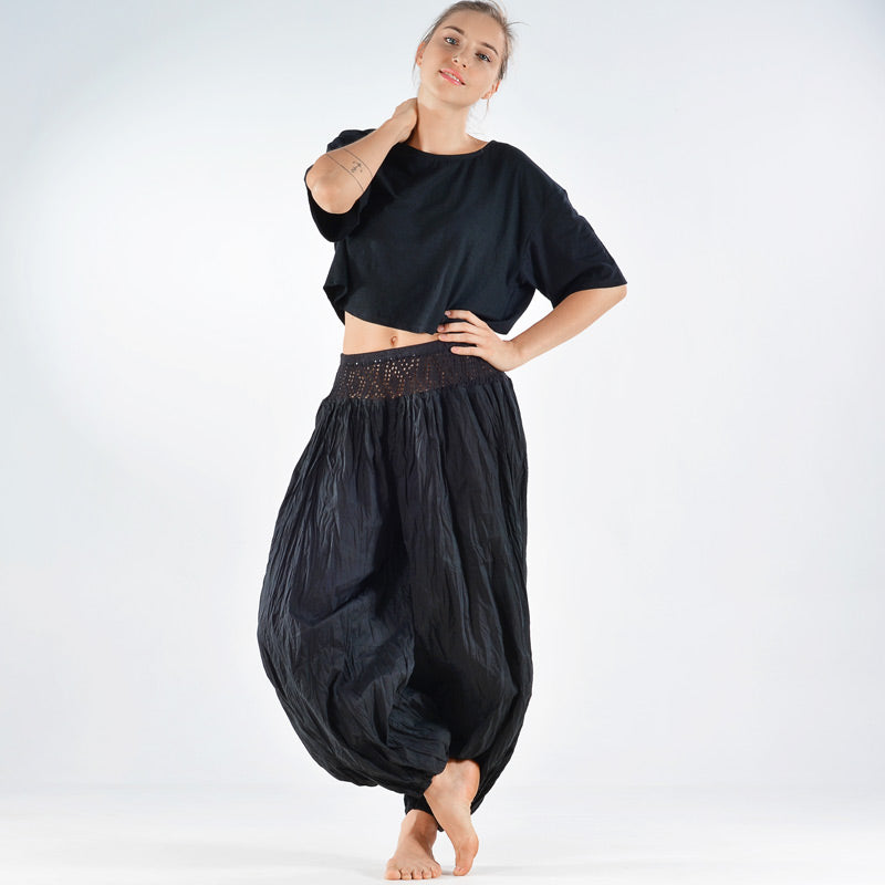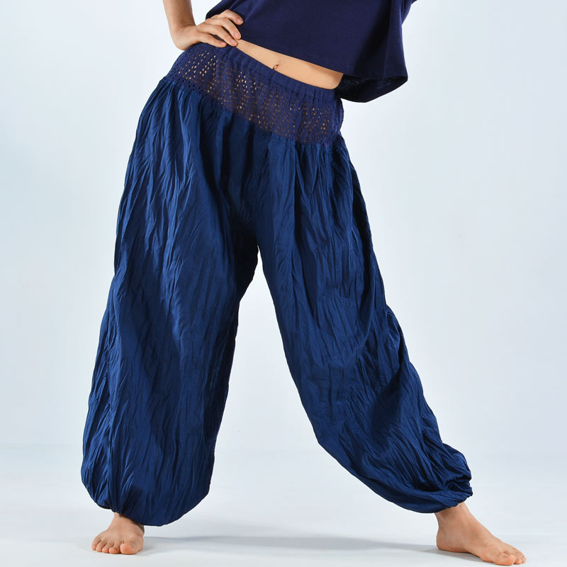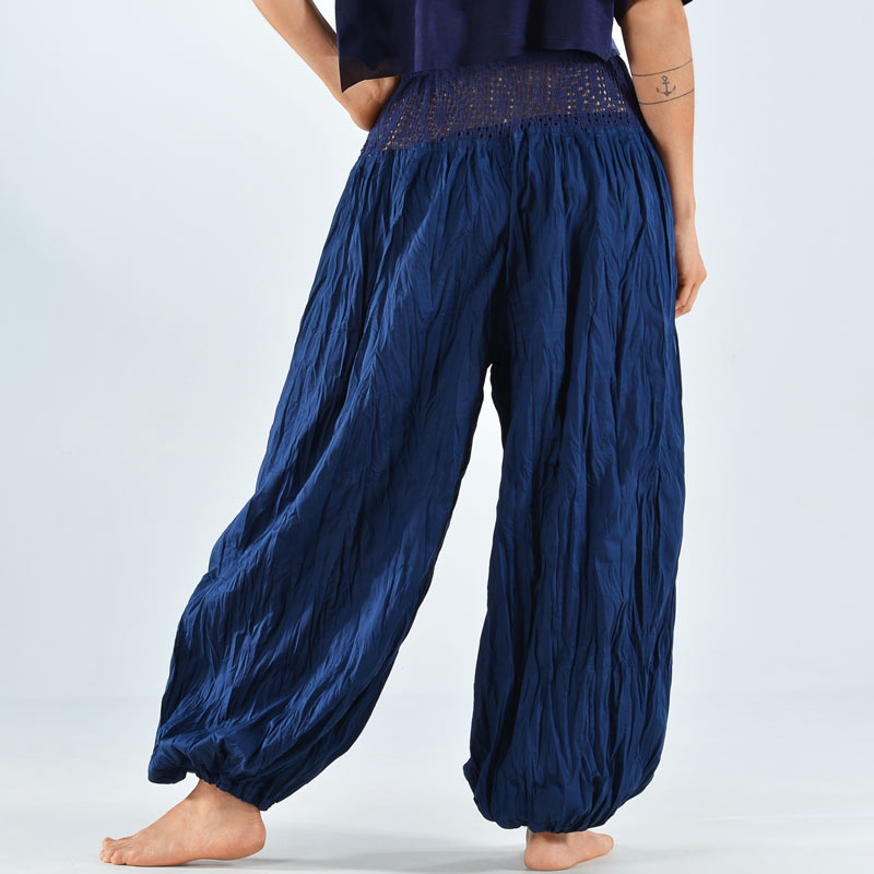 These handmade cotton crinkle pants with a knitted waistband are breezy and comfortable. They keep you cool and provide you with the freedom of movement.