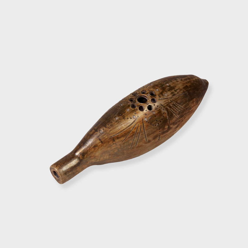 This interesting air instrument is coming from the rich tradition of the Andean clay flutes and whistles. Through its specifically constructed chamber it amplifies the sound of breath and can be manipulated in its intensity and impact through using the hand to mute and alter the intimate sound of the natural movement of the ‘wings of breath’.