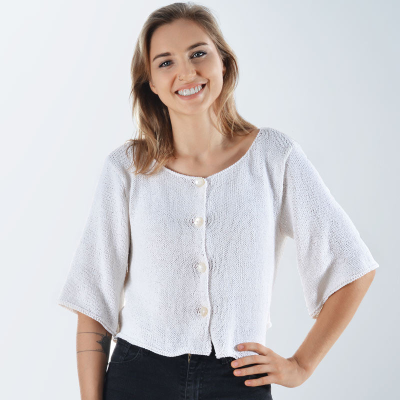 Hand knit from soft cotton, this cute jacket comes with flared sleeves and a flattering boat neck– making it perfect for those days when keeping comfortable and staying in style is high on the agenda. It goes well with high-waisted leggings or jeans.