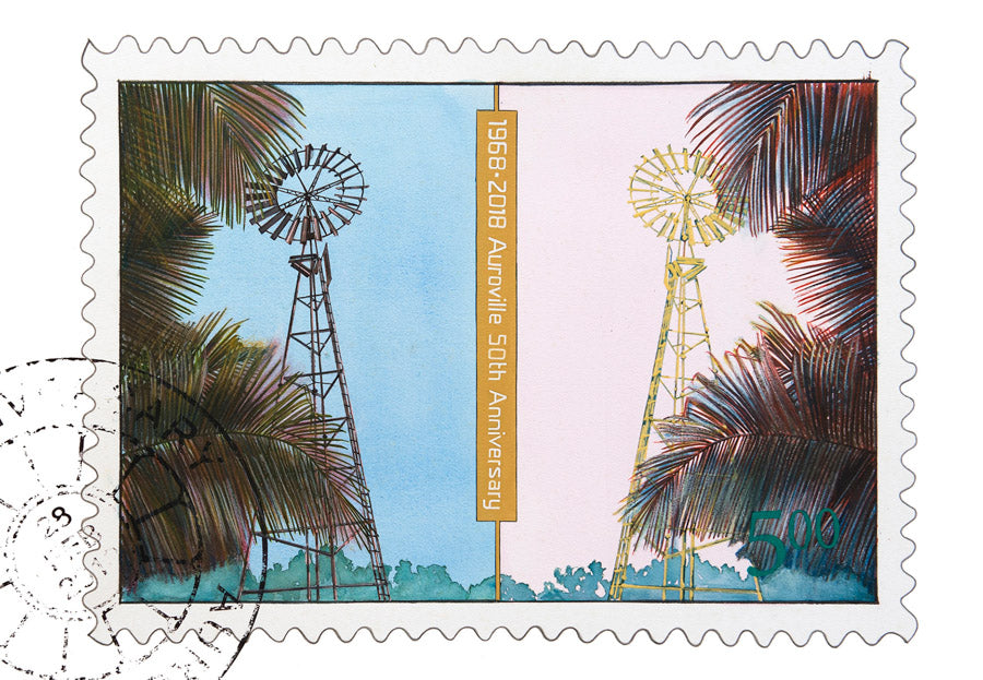 This postcard gives you an artistic view of one of Auroville's Windmill.