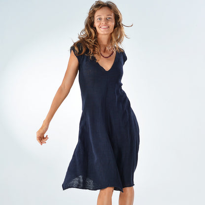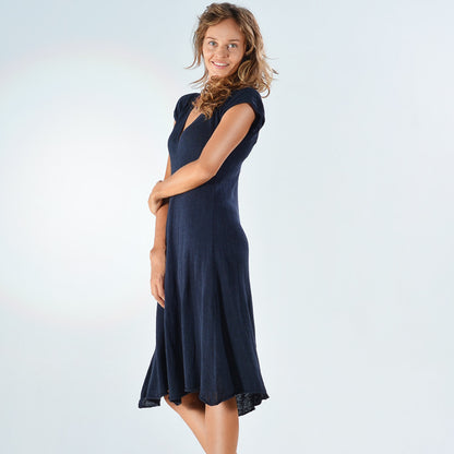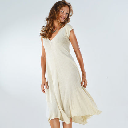 Make heads turn with this beautiful A-line silk dress in stocking stitch, short sleeves with a twisted hem.