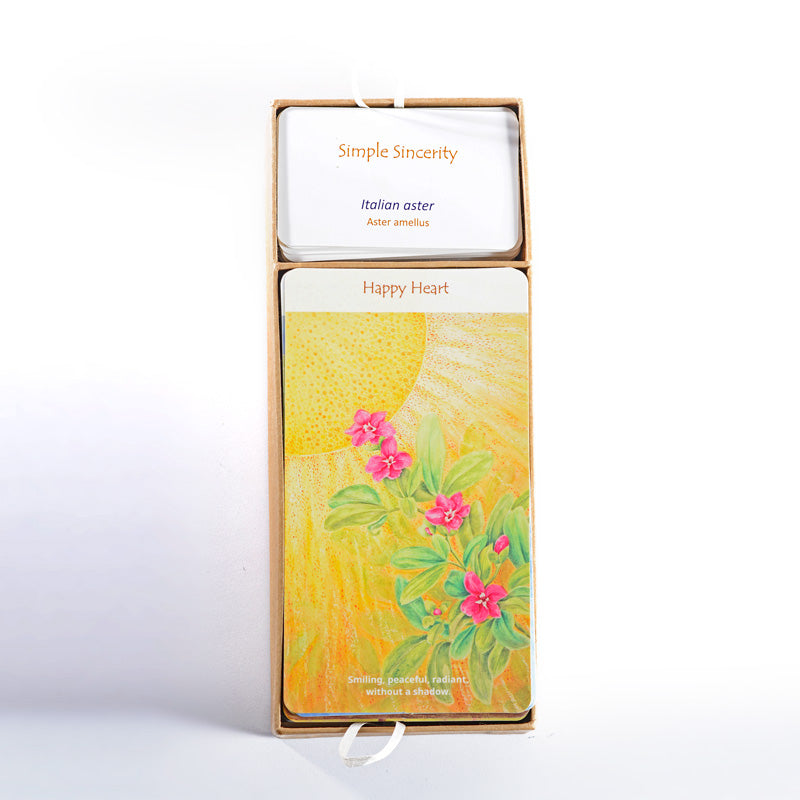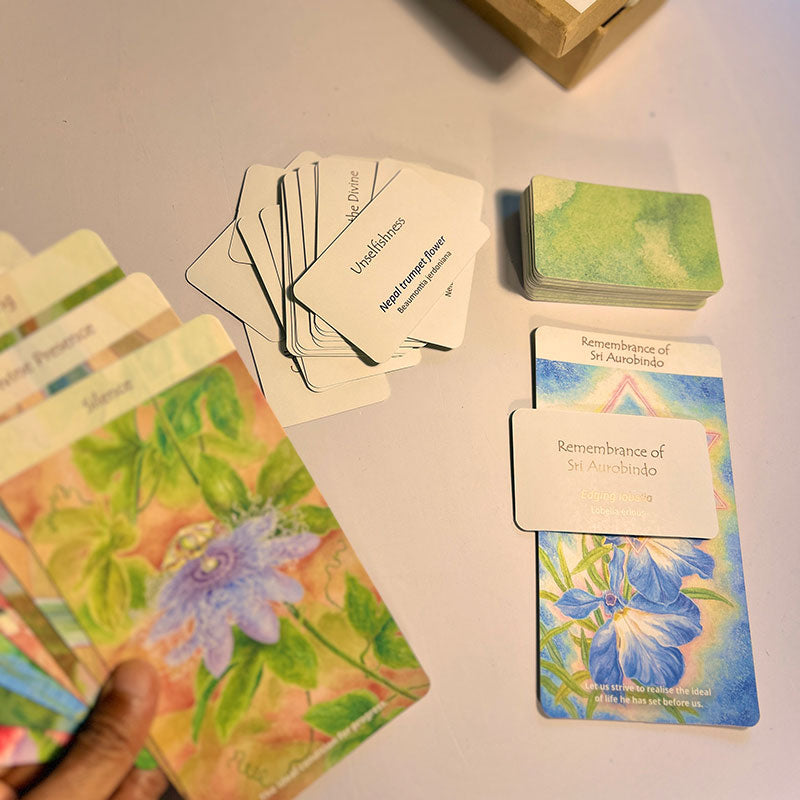 Content: Deck of 80 illustrated flower cards and spiritual messages from The Mother. Smaller deck of 80 name cards with spiritual, common, and botanical names for each flower. It is aesthetically packaged in a strong, hand-crafted kraft paper box.