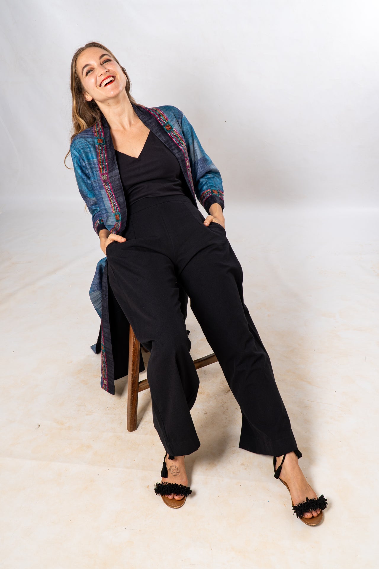 Blue Tussar Silk Hand Painted Embroidered Long Jacket