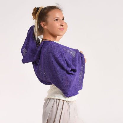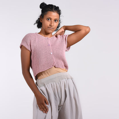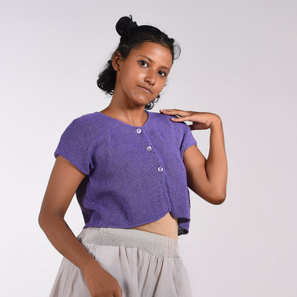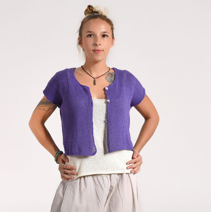 This Bolero Round-Neck Top is hand knitted, made with 100% organic cotton, with beautiful shell buttons. Can be worn as a pretty jacket or as a top, sure to add a colorful touch to your wardrobe.