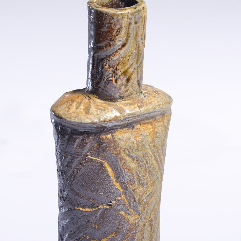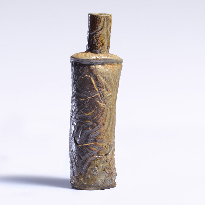 Anangama fired bottles can serve as a tall vase or simply adorn any space with its earthy presence.. This work has no glaze. The ash from wood during firing creates the patina