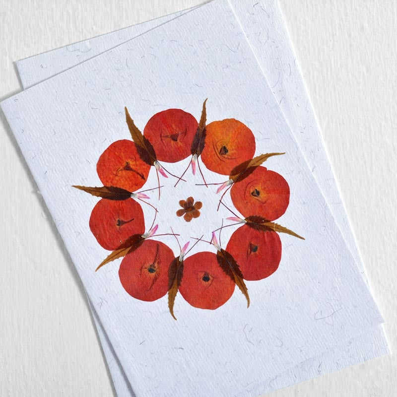 Materials used: The paper is hand-made from recycled cotton, enhanced with natural fibres like straw, gunny, or wool. Flowers are organically grown, then handpicked and pressed each day