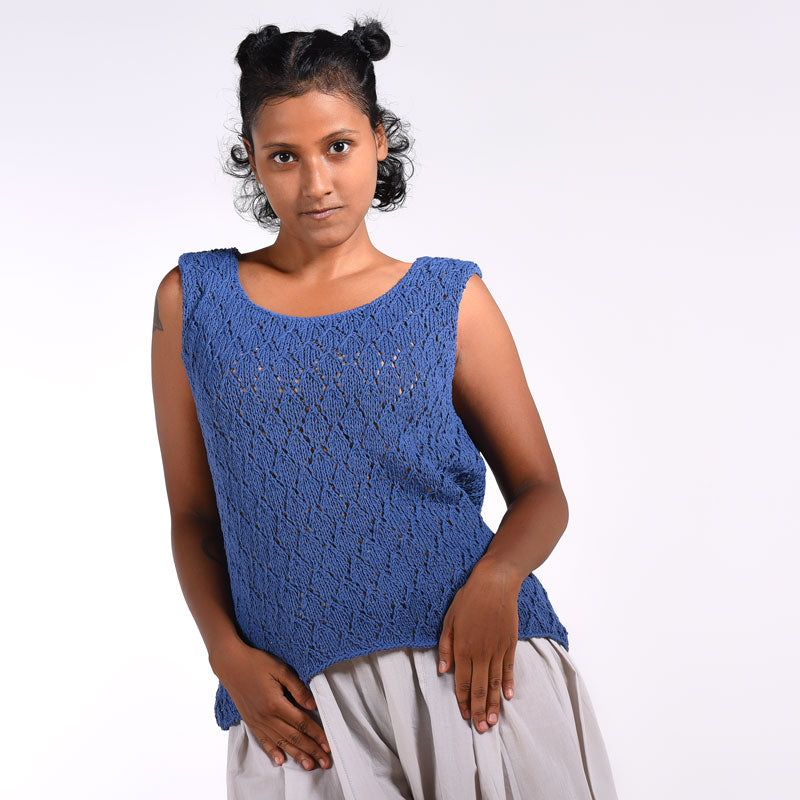 This Celine Lacy Round-Neck is hand knitted, made with 100% organic cotton, sleeveless for the summer months. Sure to add a colorful touch to your wardrobe with its blue lace knitting.