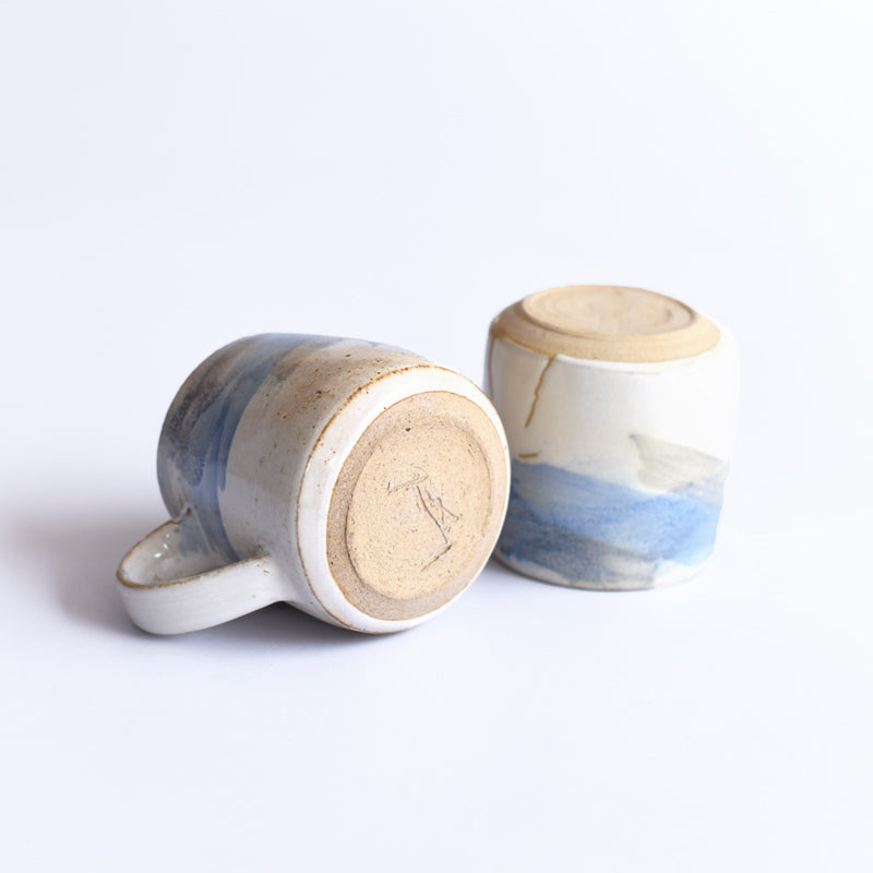 Elegant mugs with a narrow mouth to keep warm drinks warm longer. Soft tones with blue sea waves to remind us of the ease of the sea side