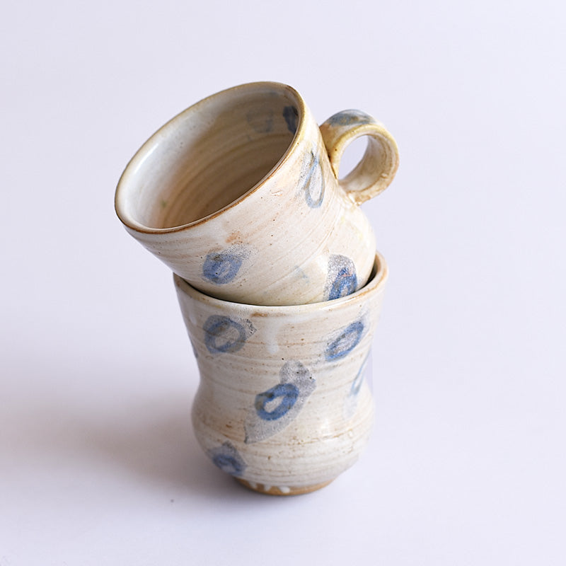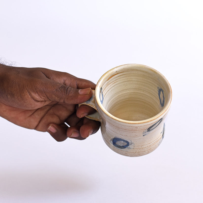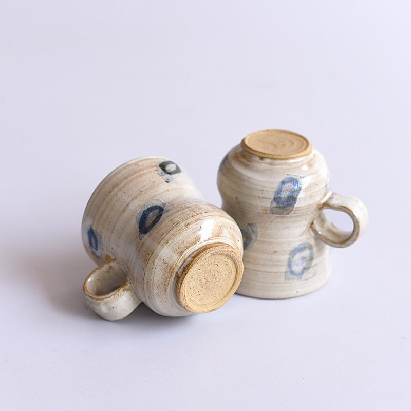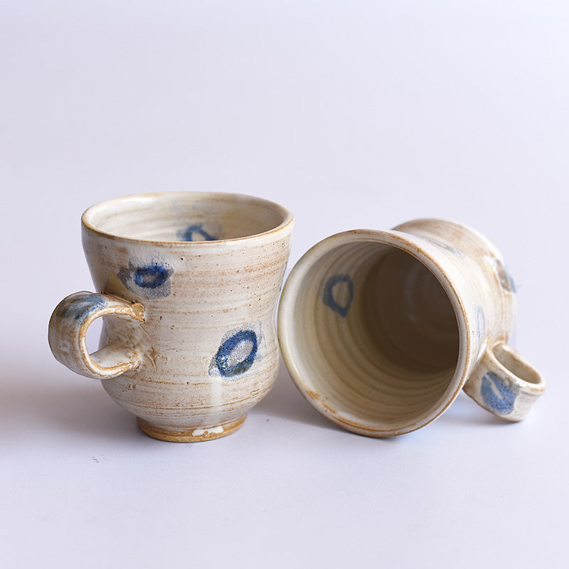 These handcarfted, low waist mugs have a very unique single finger handle. The blue swirls are painted on the glaze to invite joy and wonder into our daily cuppa.