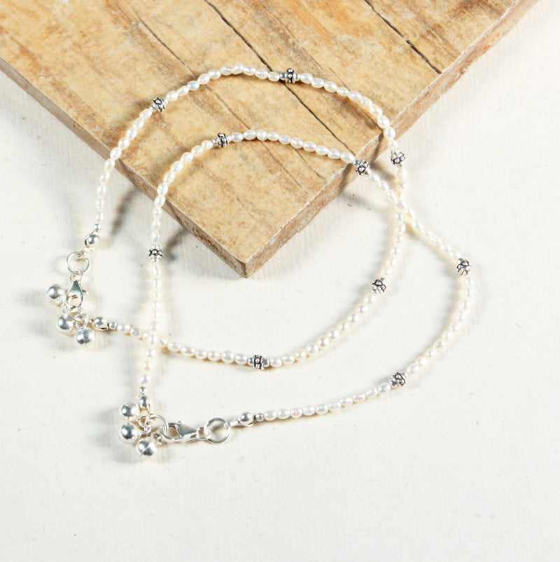 These beautiful anklets are hand crafted by the Auroville Unit Aurosunshine. The silver (92.5) is melted in Auroville and the pearls are carefully selected with an eye for detail, naturalness and purity.