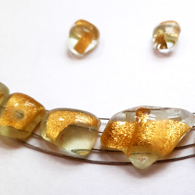 Matrigold gold creation jewellery is upcycled from the broken Gold-in-Glass tiles from the Matrimandir. Pure gold leafs (24 karat) are placed between 2 layers of glass and fused while under vacuum. Once cooled, the fused tiles are cut by the artist, recombined and heated again to create the final shaping. Due to this unique process, we are able to offer jewellery containing pure gold for a very reasonable price. All the unique and beautiful single pieces in this line are totally differend and one of a kind.