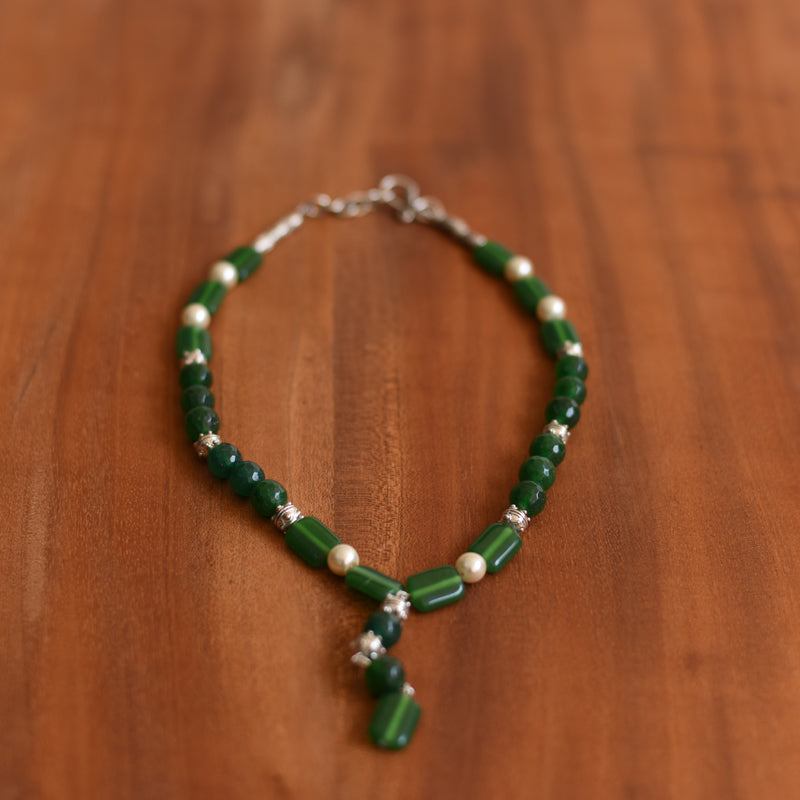 An enchanting blend of green glass beads, luminous pearls, with German silver accents, this piece carreies the quiet charm of a forest at dusk - Graceful, grounded and effortlessly striking with matching earrings