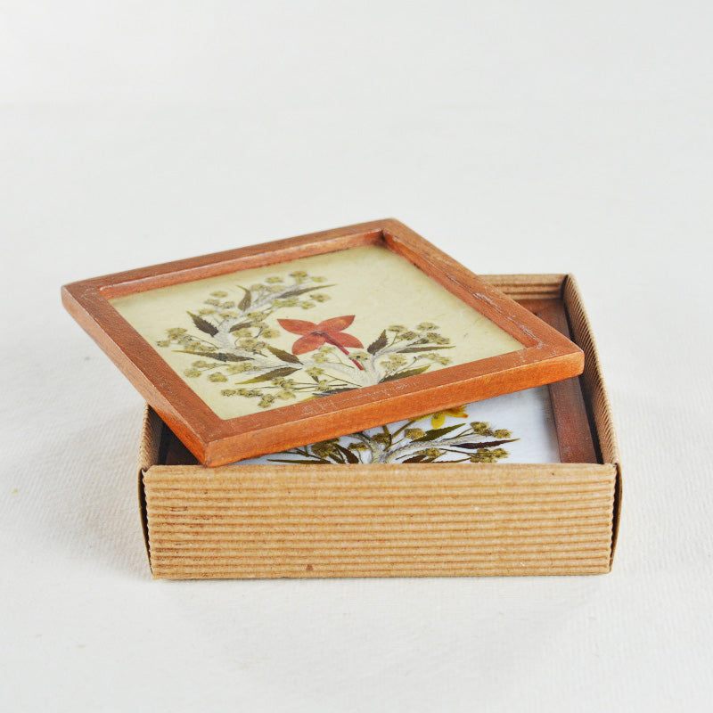 Classic flower - Intricately worked flowers, leaves and grasses decorate this series in the characteristic Shradhanjali style. Six different flowers are used in each set of coasters. The paper is made with recycled cotton rags and straw fiber.