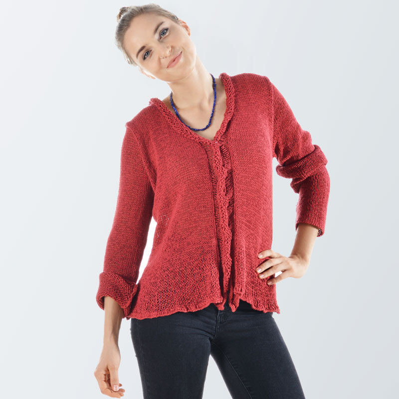 This ultra-feminine cotton hand knit jacket is full of vintage charm. The frills give the soft cotton jacket a special touch. It looks cute with your favorite skinny jeans for every day and a classic skirt for business meetings.