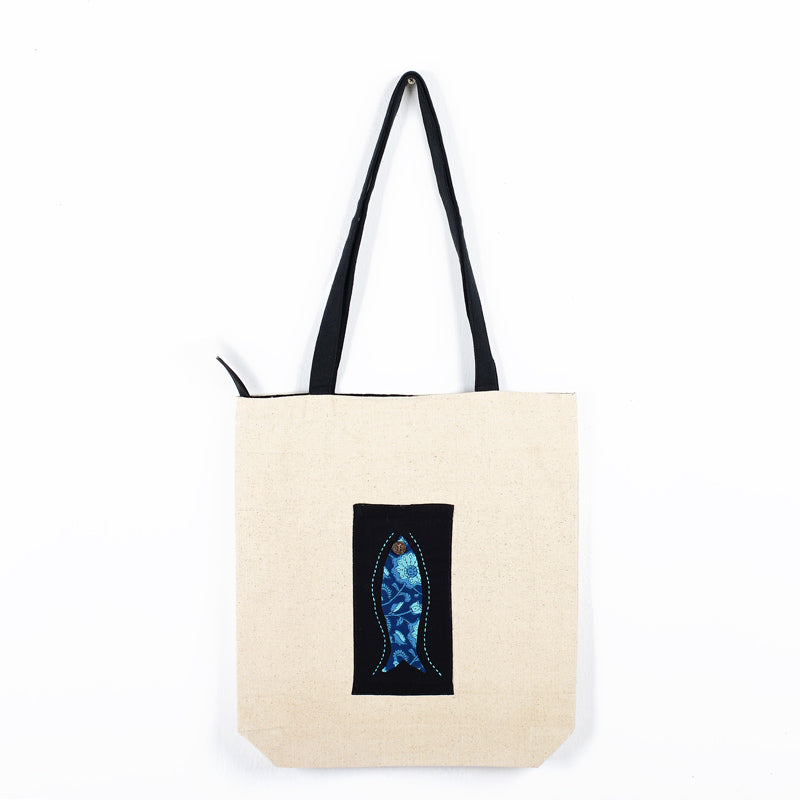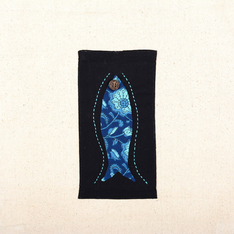 Made of thick canvas cotton embellished with a hand-appliqued fish on a black fabric bordered with hand embroidery. Has a zipper closure and an outside pocket for keys and a cell phone.