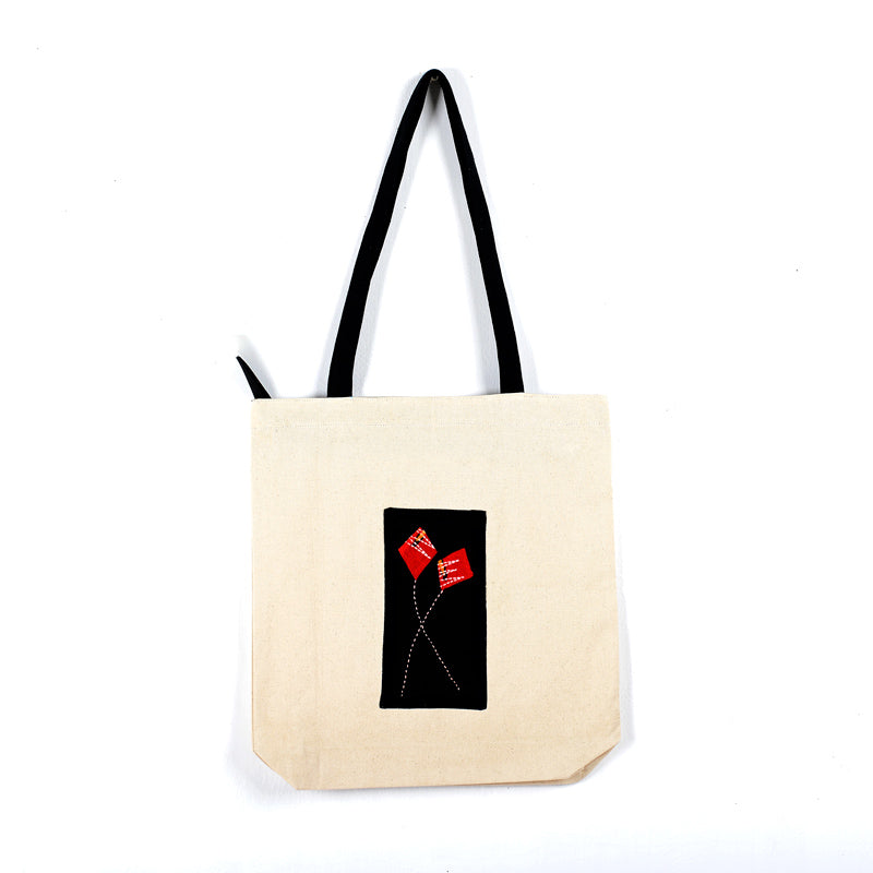 Made of thick canvas cotton embellished with two hand-appliqued kites on a black fabric bordered with Kantha stitch. Has a zipper closure and an outside pocket for keys and a cell phone. Our products are eco-friendly and convenient for day-to-day usage.