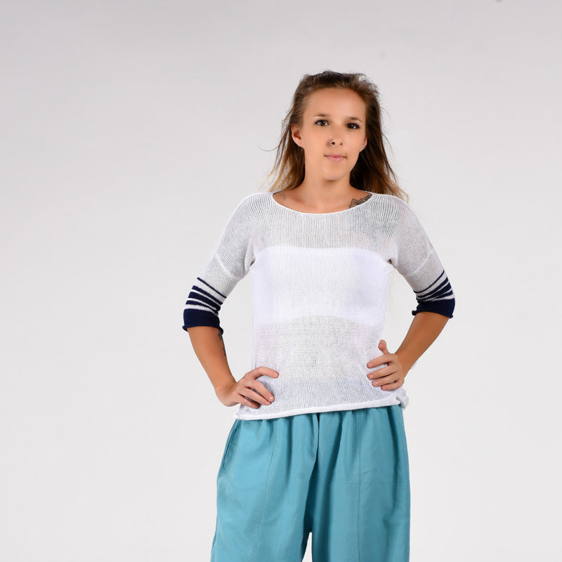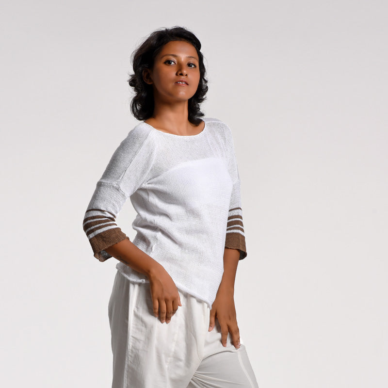 This thin pleasantly light pure cotton top is fashioned with three quarter sleeves with a design at the border of the sleeves. It is super comfy and can be worn on a holiday or at work! It goes well with your favourite pants, shorts or shirts.