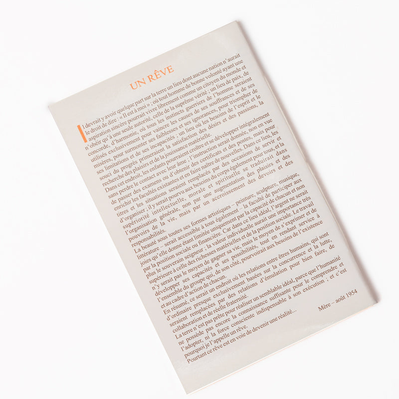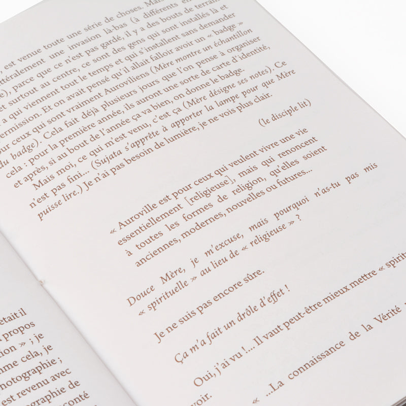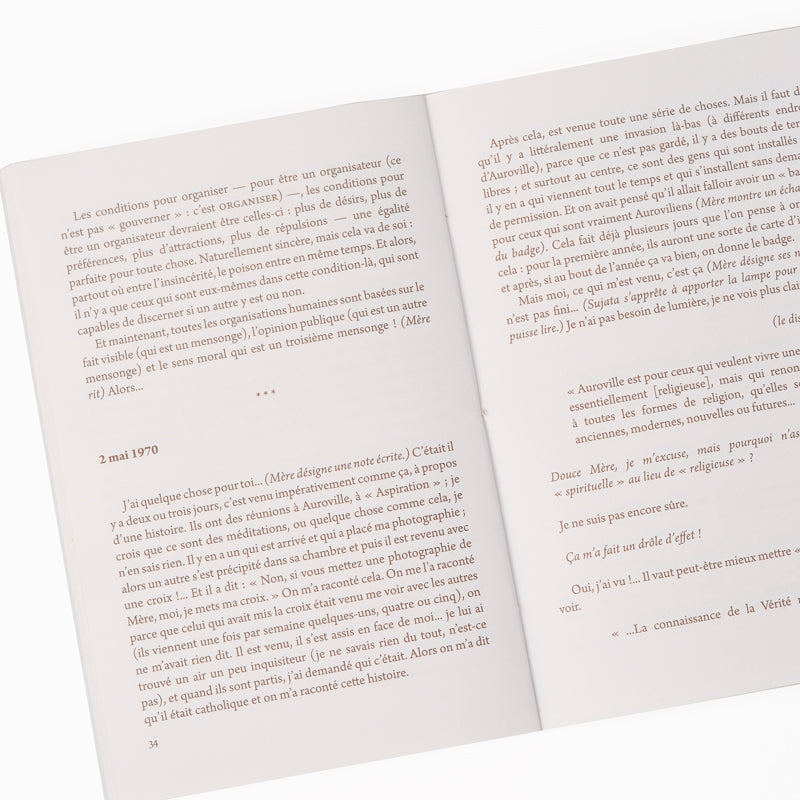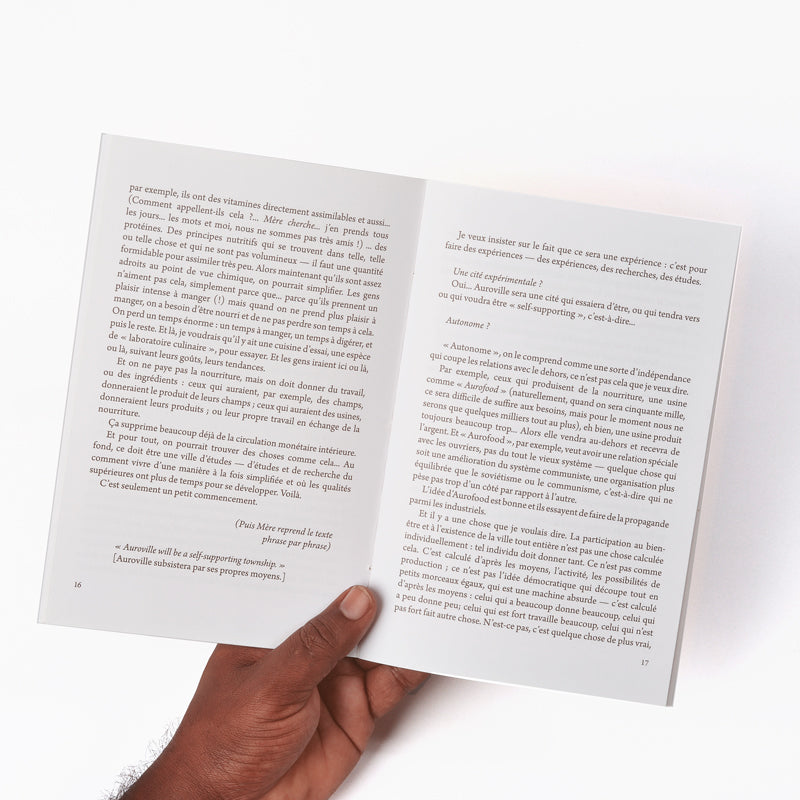 We present here a few key conversations or texts of Mother about Auroville. Whatever indications Mother gave about this project were never dogmatic or definitive. This is why it is so wrong to extract a few sentences and present them as her views on Auroville. Here Mother’s words are presented in their context, along with the questions that led to her answers. The large extracts allow the reader to enter into the true spirit of Auroville, which is a spirit of progress where nothing is ever dogmatic.