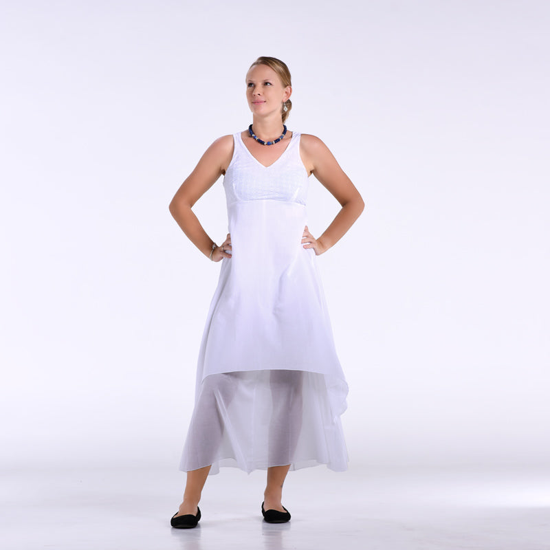 Relaxed sleeveless summer dress. Perfect for evening parties and can be styled with our crop jacket. A-line silhouette High waist, ankle-length curvy V-neck, sleeveless Broderie Anglaise front and back bodies double layered. The symmetrical curved top layer Pico stitch hem.