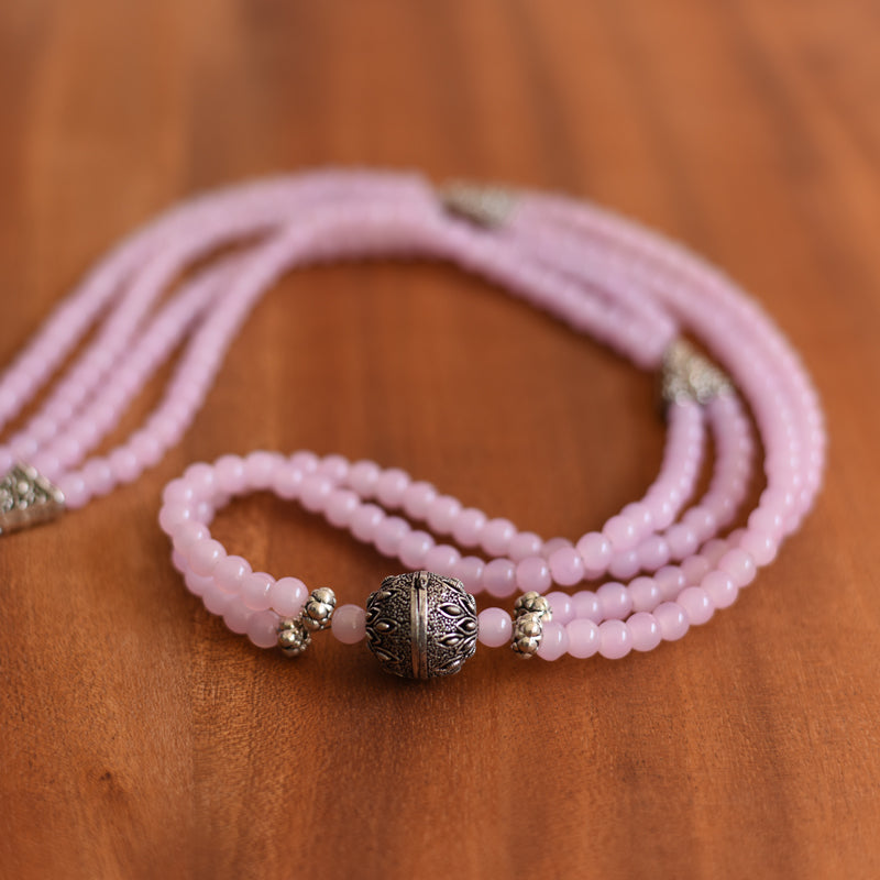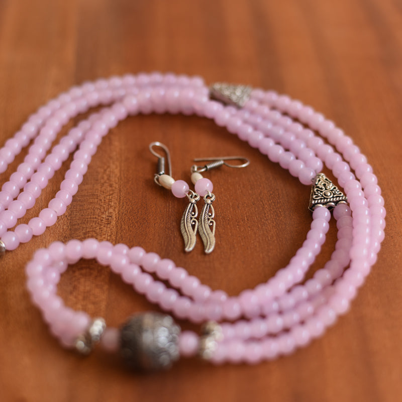 Pink Meadow is a delicate two-row necklace crafted with soft pink beads, evoking the gentle beauty of a blooming field at dawn. Designed in a minimal style, its layered simplicity brings a touch of effortless charm — perfect for adding a whisper of color and grace to your everyday look, especially with its matching earrings