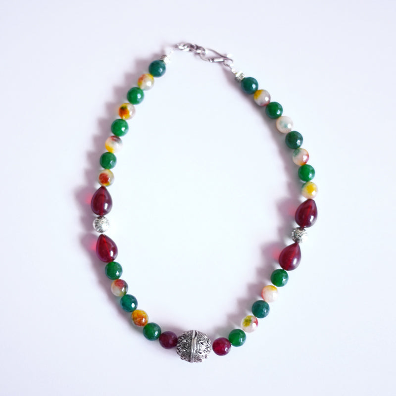 Add a touch of regal elegance to your ensemble with Priti Necklace. Handcrafted with multi colored agate semi precious stones with a German silver center piece Priti necklace promises to display your uniqueness. Style it with modern or ethnic outfit for special occasion or every day wear.
