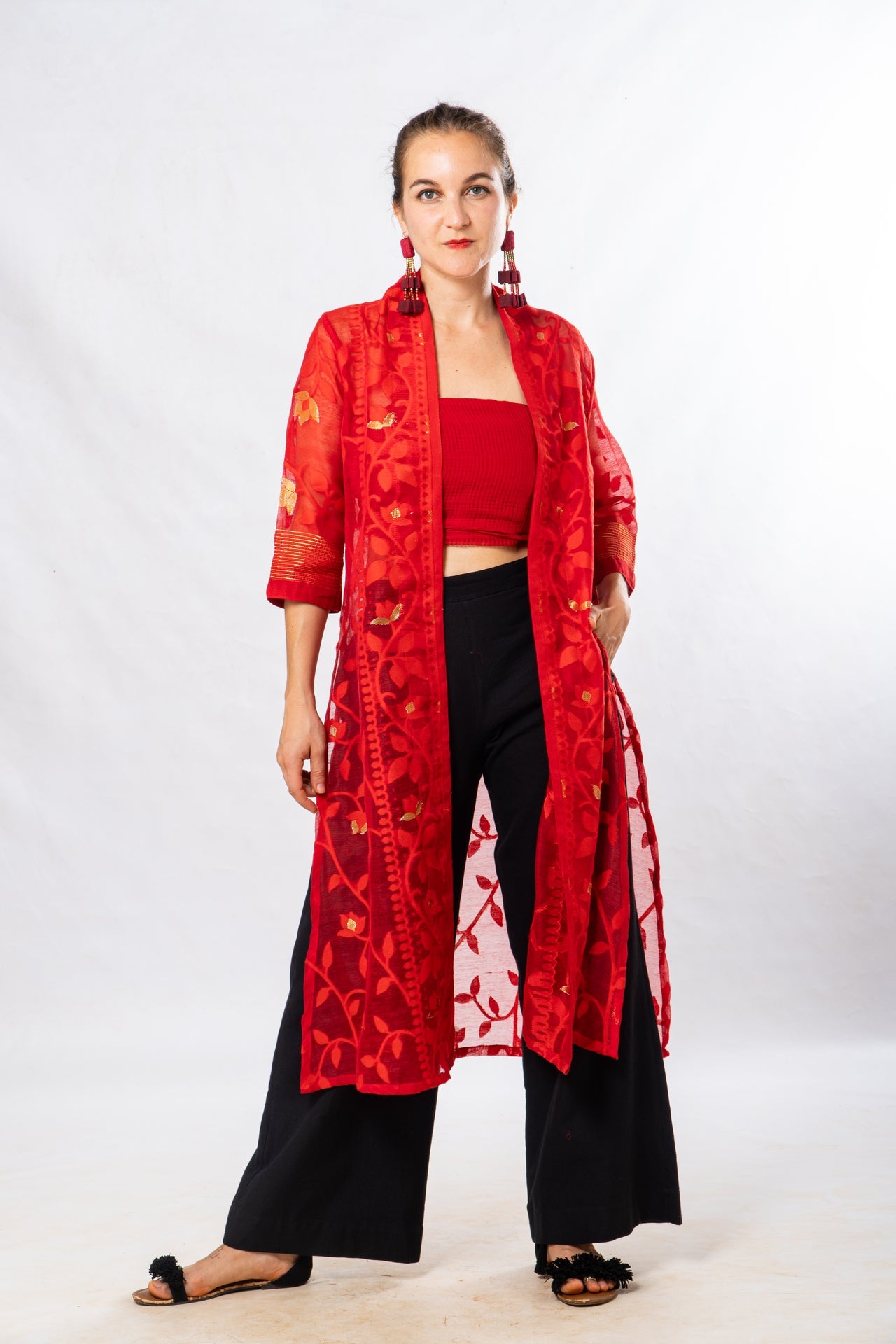 Elevate your festive and occasion wear with this Red Cutwork Silk Bengal Jamdani Long Jacket, exquisitely woven by skilled artisans. Crafted in silk, it features intricate cutwork detailing and signature Jamdani motifs that add timeless elegance and heritage charm. The long, flowy silhouette makes it perfect for layering over dresses, or contemporary Indo-western outfits, offering a bold yet refined statement piece for celebrations, weddings, and special events.