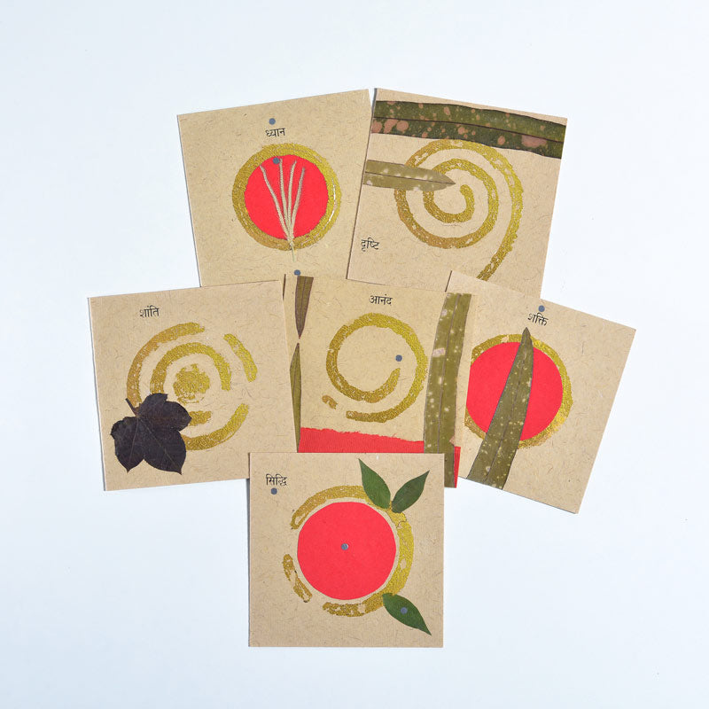 Send out well-being blessings in Sanskrit with these handmade cards from the Auroville Unit Shradhanjali. Each card gives a Sanskrit blessing from the age-old practice achieved by yoga. Each card is individually handcrafted.