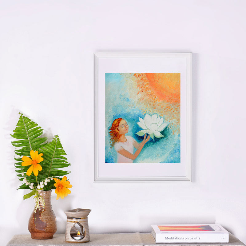 Make your living space meditative with Blissful Offering Painting, framed print by Savitri Art—an exclusive A4 oil masterpiece created through meditation on Sri Aurobindo's Savitri. Crafted by Padmarani Vandematram, a distinguished artist from the Savitri Art Sangha, this piece is one of 150 offerings for Sri Aurobindo's 150th anniversary. A sacred infusion of artistry.