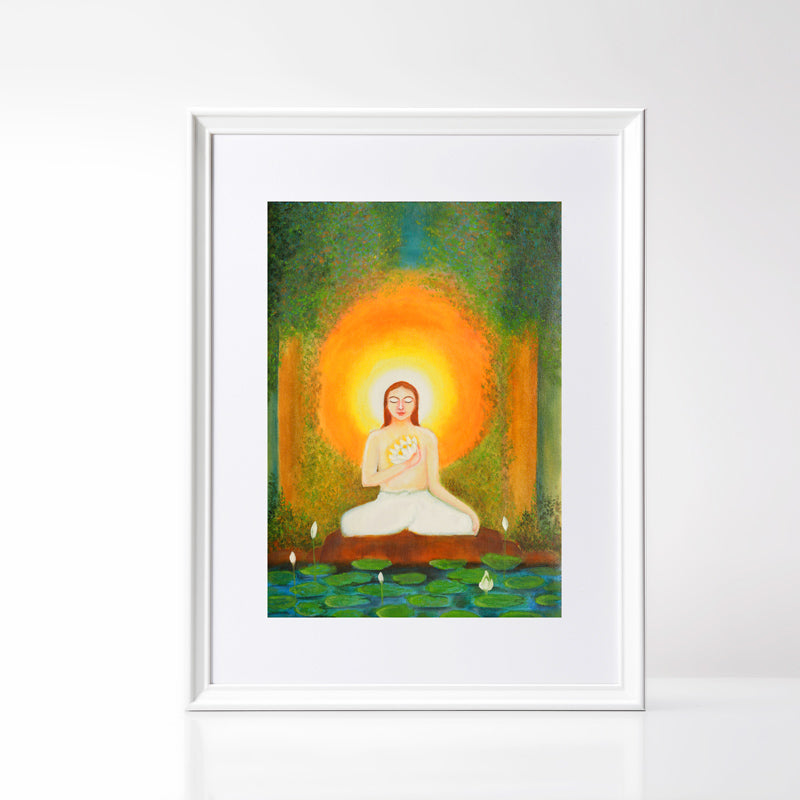 Make your living space meditative with Eternal's Touch Painting, framed in print by Savitri Art—an exclusive A4 oil masterpiece created through meditation on Sri Aurobindo's Savitri. Crafted by Usha Aravind, a distinguished artist from the Savitri Art Sangha, this piece is one of 150 offerings for Sri Aurobindo's 150th anniversary. A sacred infusion of artistry.