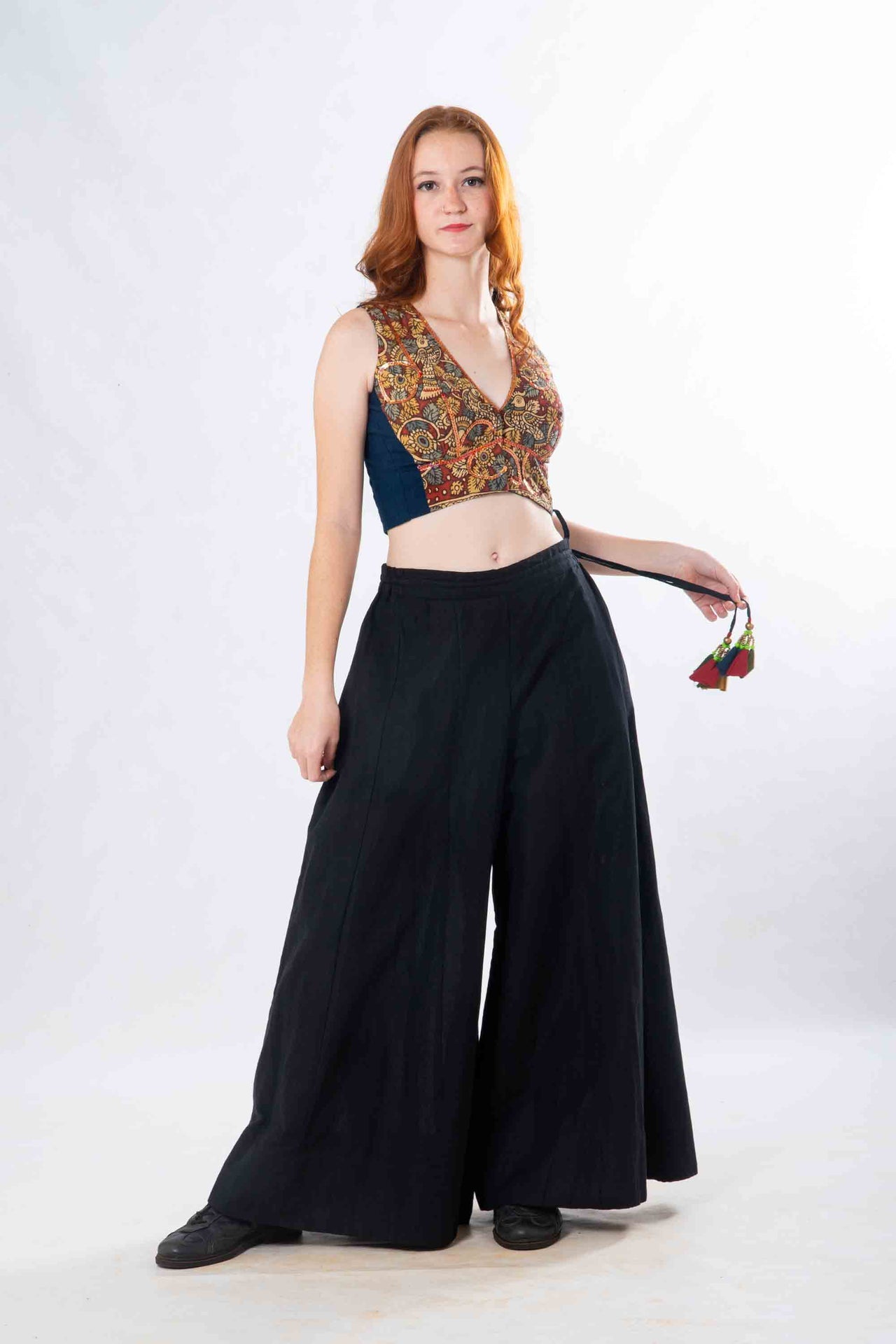 Handcrafted in soft organic cotton, this set features a Kalamkari patchwork crop top paired with relaxed pazzao pants. Lightweight, breathable, and artisan-made, it blends effortless comfort with timeless Upasana detailing—perfect for everyday wear or mindful living.