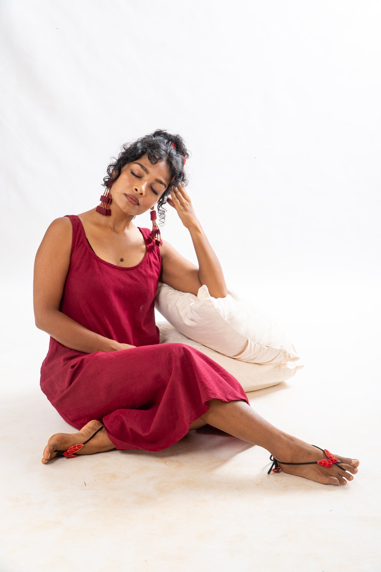 Effortlessly chic, this maroon solid Sleeveless dress with pockets is paired with a naturally dyed, hand block printed flared jacket—perfect for stylish, comfortable workwear or everyday elegance.