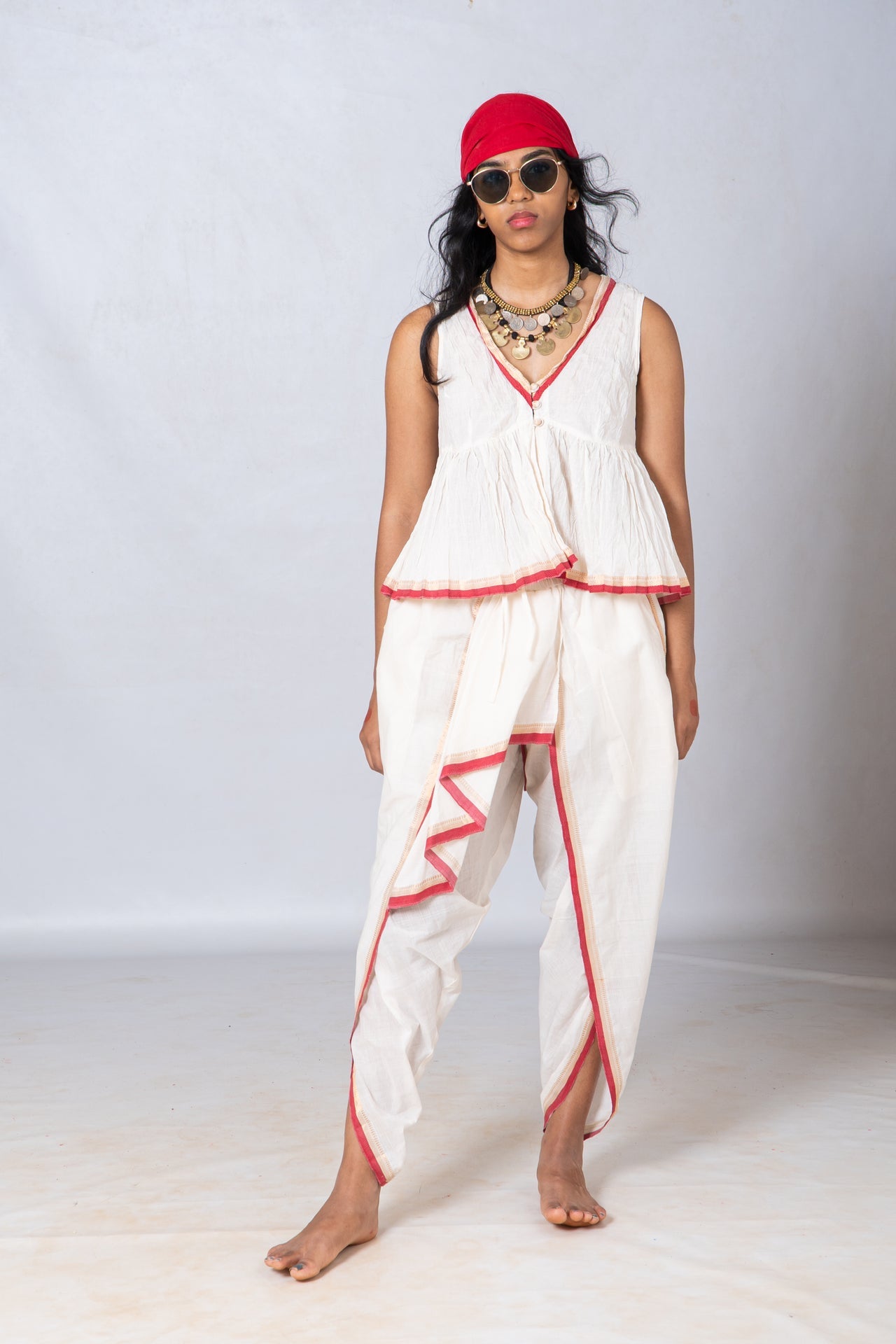 Elevate your ethnic style with this handcrafted Top & Dhoti set, beautifully crafted from a khadi Jamdani and organic mul. Soft, breathable, and sustainably made, this elegant ensemble offers timeless comfort perfect for festive wear, cultural events and everyday traditional styling.