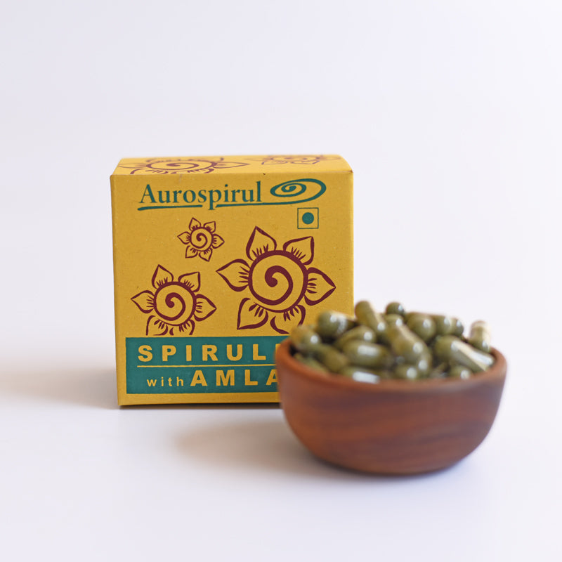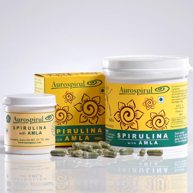 Origin information: Amla is grown in India and Spirulina is cultivated and sun-dried in Auroville.