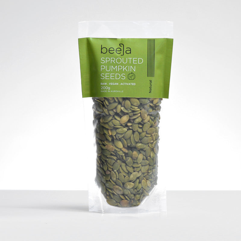 Beeja is an Auroville unit dedicated to making healthy, raw and vegan dry food products. This pack of activated and sprouted pumpkin seeds is great for your body as it is rich in antioxidants.The sprouting process of the seeds activates live enzymes and enhances its nutritional value. Eat it for it's great taste, while arming your body with this superfood's health benefits.
