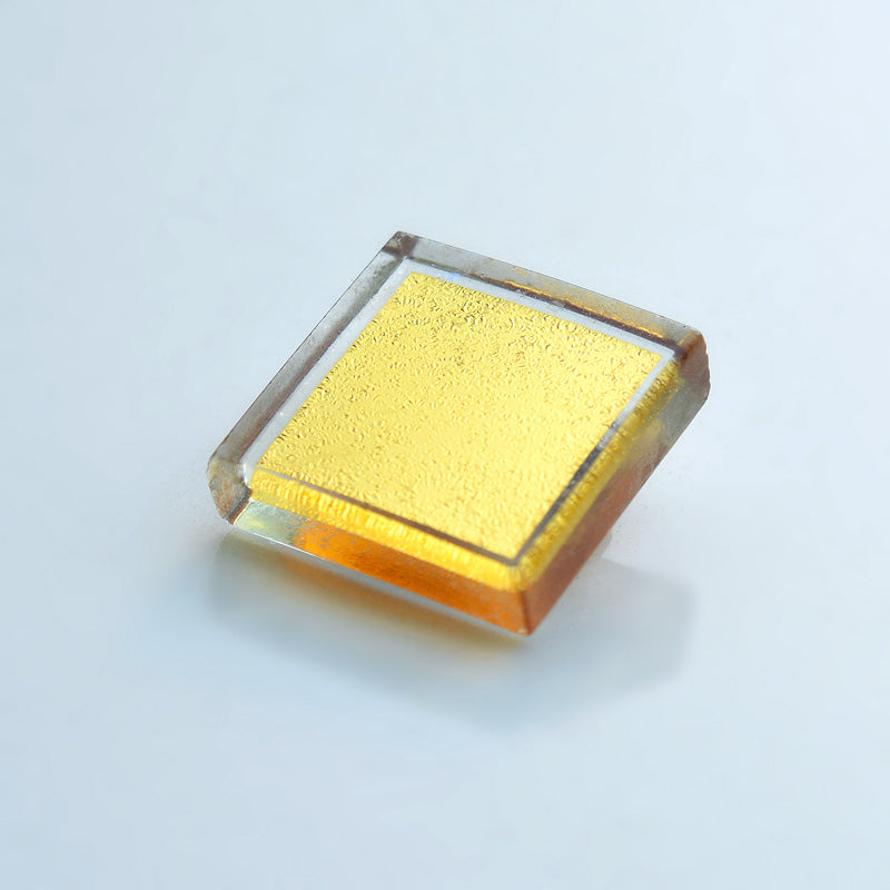 Pure gold leaves (24 karats) are fused in between glass forms in a vacuum process, with the same manufacturing technique used on the Matrimandir’s golden tiles. After the fusing, every piece is ground and heated again to create its final shape.