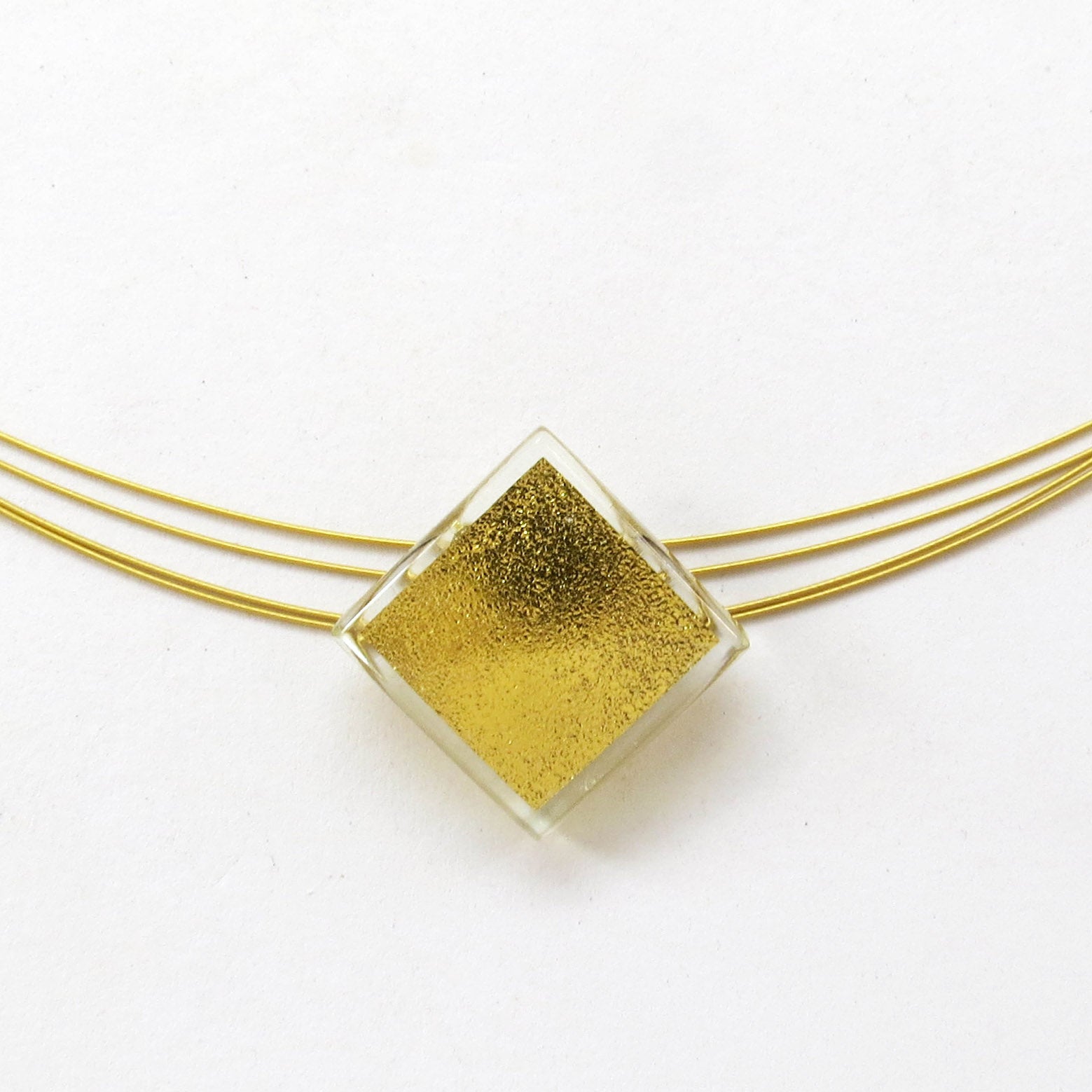 This pendant is designed and crafted in Auroville. Every single piece of jewelry is made by hand, thus creating their unique charm. The necklace is crafted with 24k gold leaves fused in between glass making it an elegant yet everyday piece of jewelry.