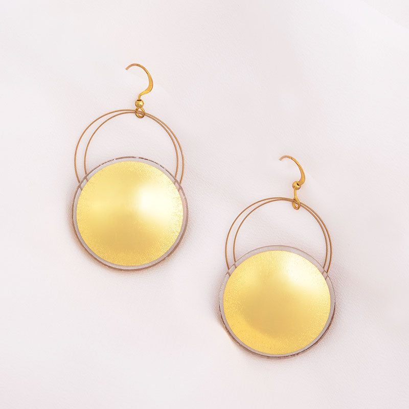Pure gold leaves (24 karats) are fused in between glass forms in a vacuum process, with the same manufacturing technique used on the Matrimandir’s golden tiles. After the fusing, every piece is ground and heated again to create its final shape.