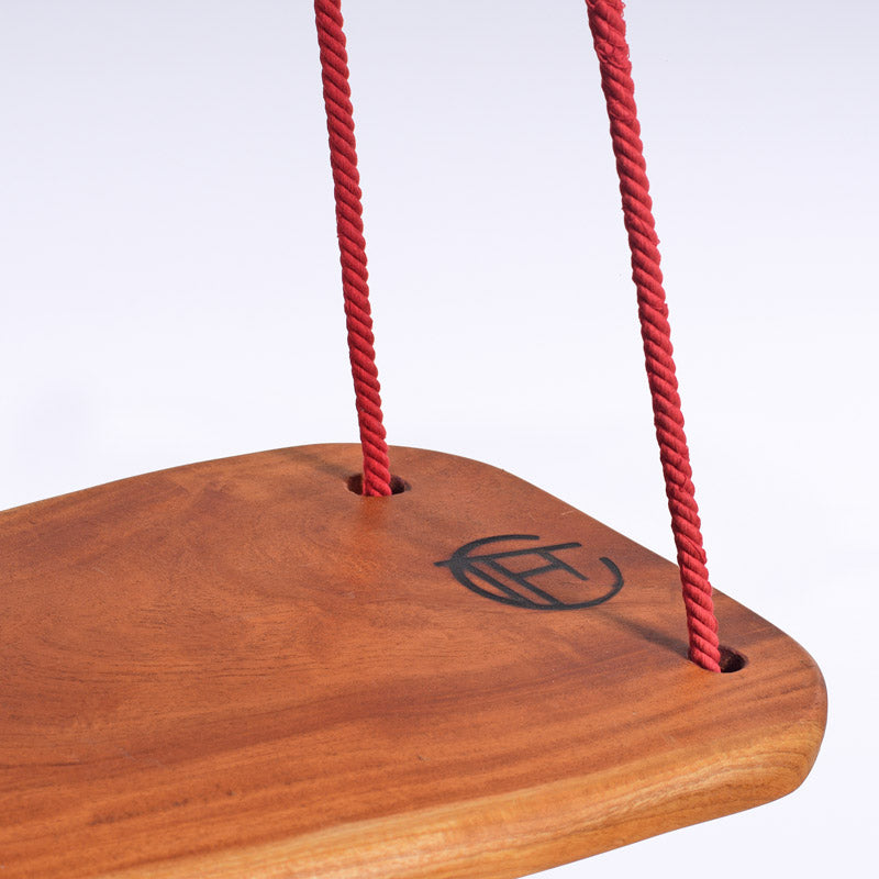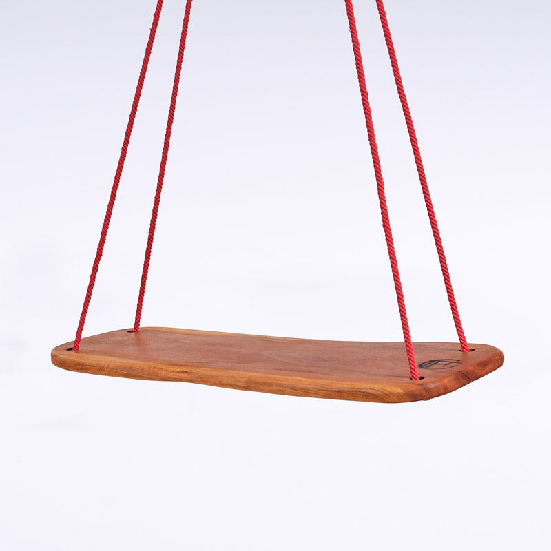 A Tropical hardwoods plank swing. Varnished for exterior durability. Including rope for hanging indoors and outdoors. Slim and a perfect fit into any living space or garden.