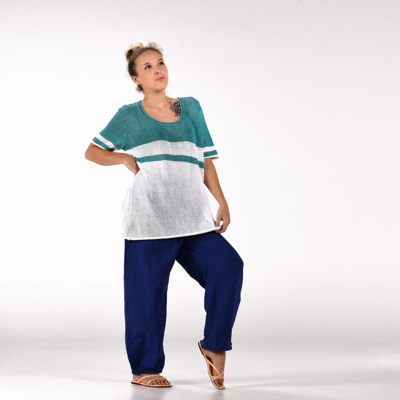 Your skin will love the feel of this finely textured knit made of pure organic cotton. It features a round neckline and has short sleeves with a stripe design at the hem giving you an airy feeling. The top is flexible, light and can be worn anytime anywhere!