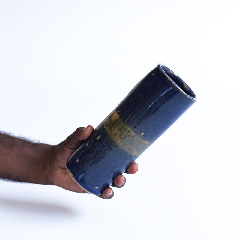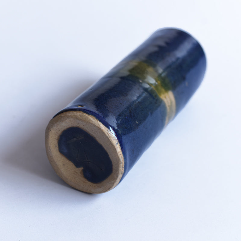 A straight tall vase in sober blue tone with a mid line of green. Perfect for fresh flowers and also by itself an elegant presence.