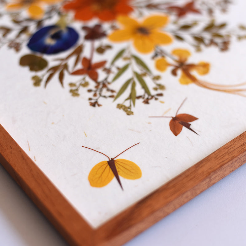 Adorn your walls with intricately handcrafted pressed flower and leaf wall art - a luminous and colourful flower bouquet.