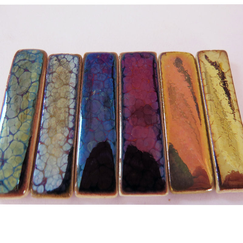 Pure gold leaves (24 karats) are fused in between glass forms in a vacuum process, with the same manufacturing technique used on the Matrimandir’s golden tiles. After the fusing, every piece is ground and heated again to create its final shape.