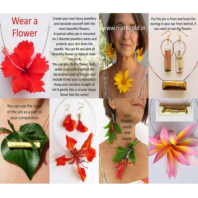 This Gold-in-Glass wear a flower necklace lets you decorate yourself with flower giving you an enchanting look. the necklace is designed and crafted by the Auroville artist Birgitta Volz. Every single piece of jewelry is made by hand, thus creating their unique charm. The stud is crafted with 24k gold leaves fused in between glass making it an elegant yet everyday piece of jewelry.