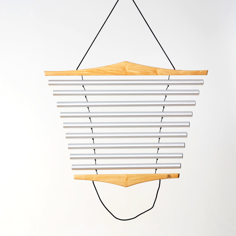 This pioneering musical instrument is one of SVARAM's NEW WAVES innovations based on harmonic, just intonation Shruti tunings on C 256 Hertz. The Chimes can be swung gently, rotated, traversed, looped, swayed around and over the body to create an immediately "touching“ experience of the magic of a spherical sound in its layered consistency and its wholesome harmonizing effect.