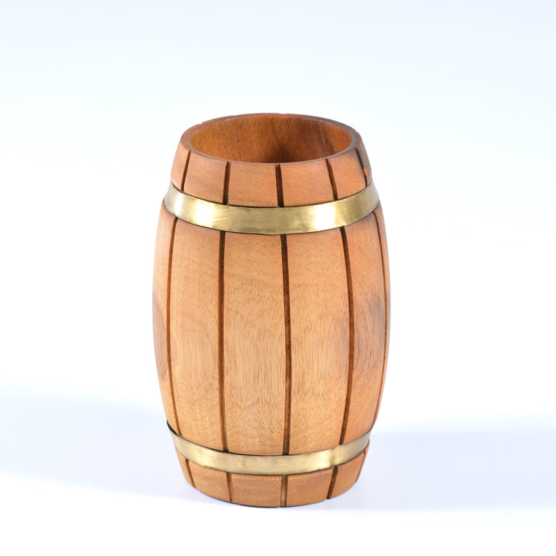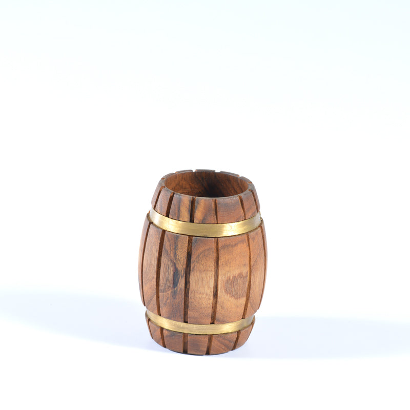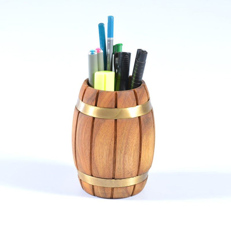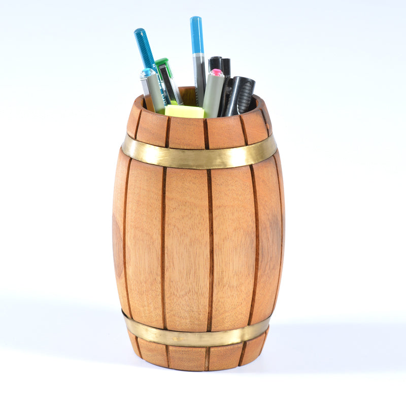 Mini barrel with decorative brass ring. Available in 3 sizes. Keep it on your desk to store pens and pencils, on your counter top or dining table to put napkins and cutlery.